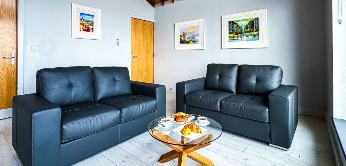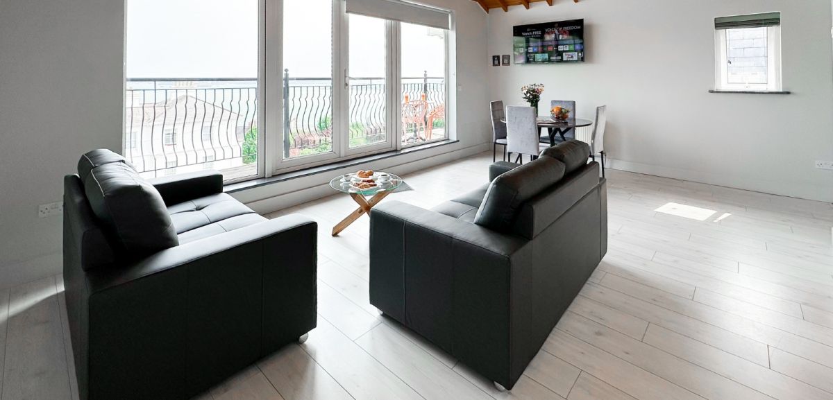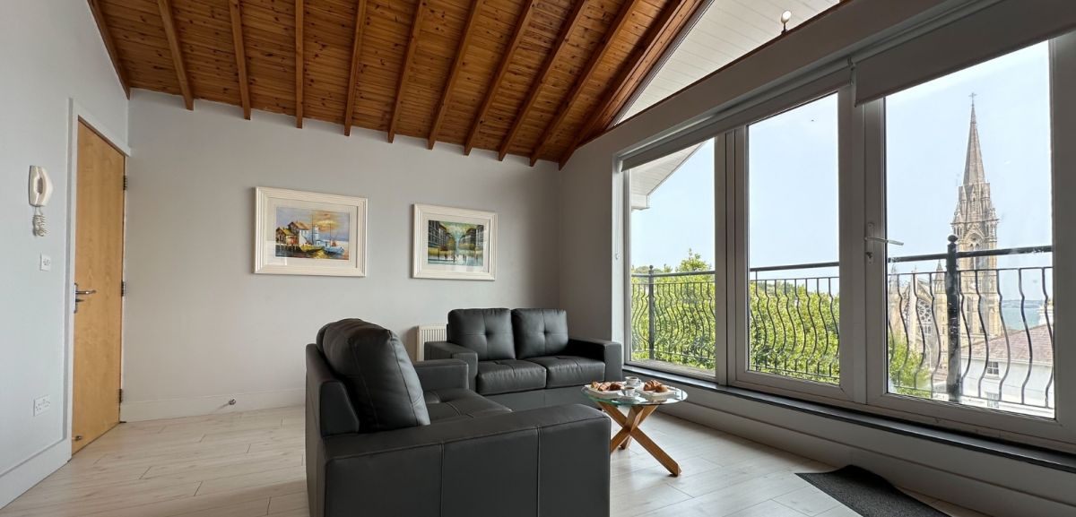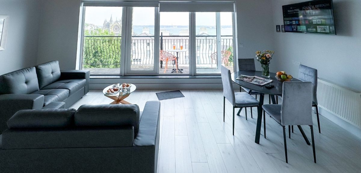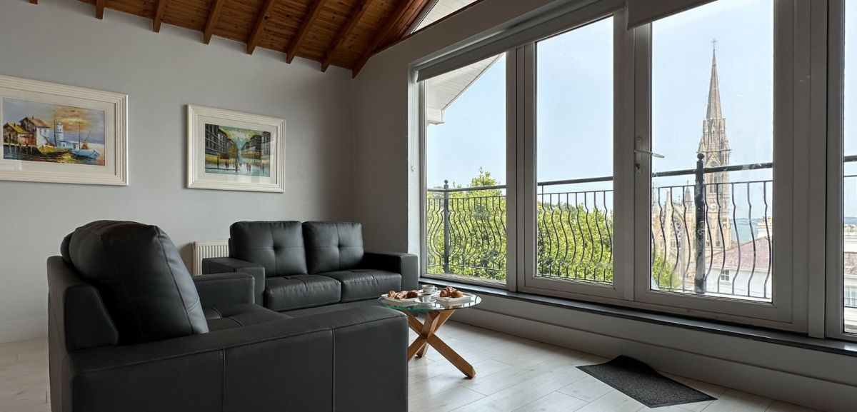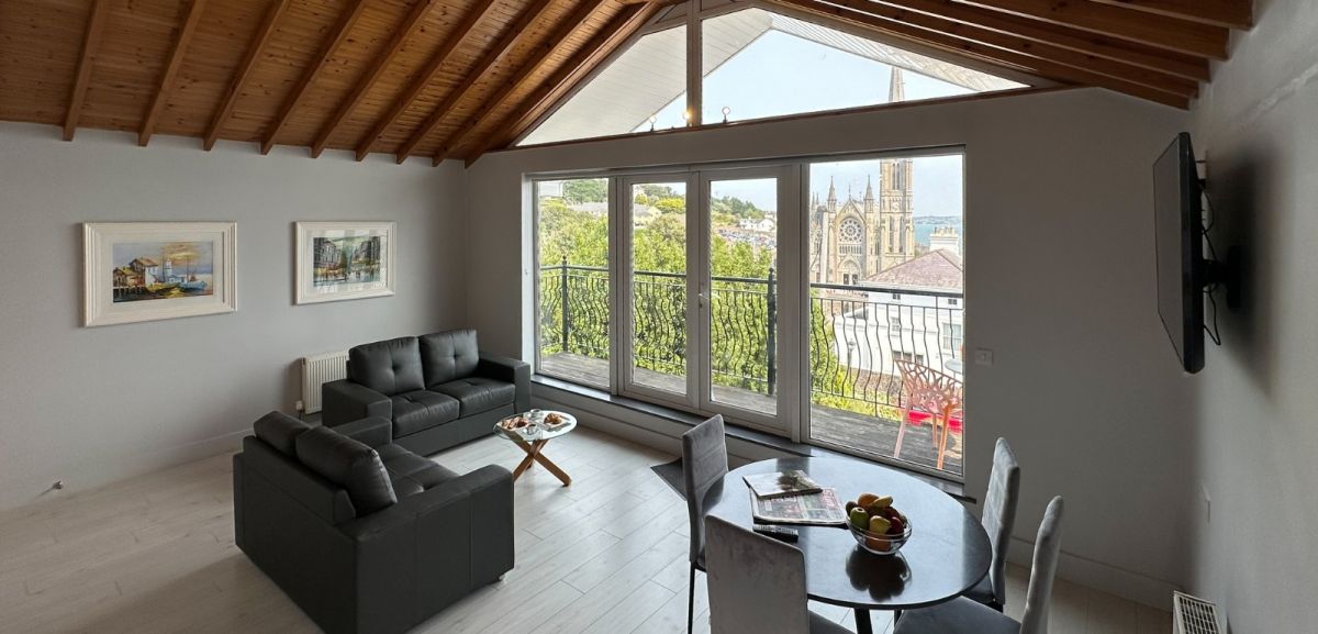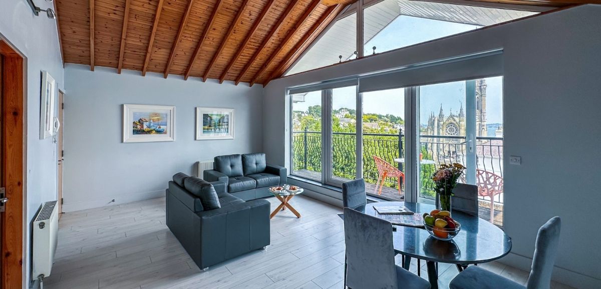 Our Penthouse Sea View Suite For 2 is complete with 1 Bedroom featuring 1 King Bed, 1 Bathroom, Fully-Equipped Kitchen and Living Area and Private Balcony with stunning views of Cork Harbour and the iconic Cobh Cathedral. The Suite offers an exceptional combination of comfort and function, featuring all of the modern amenities you would expect for a perfect stay.